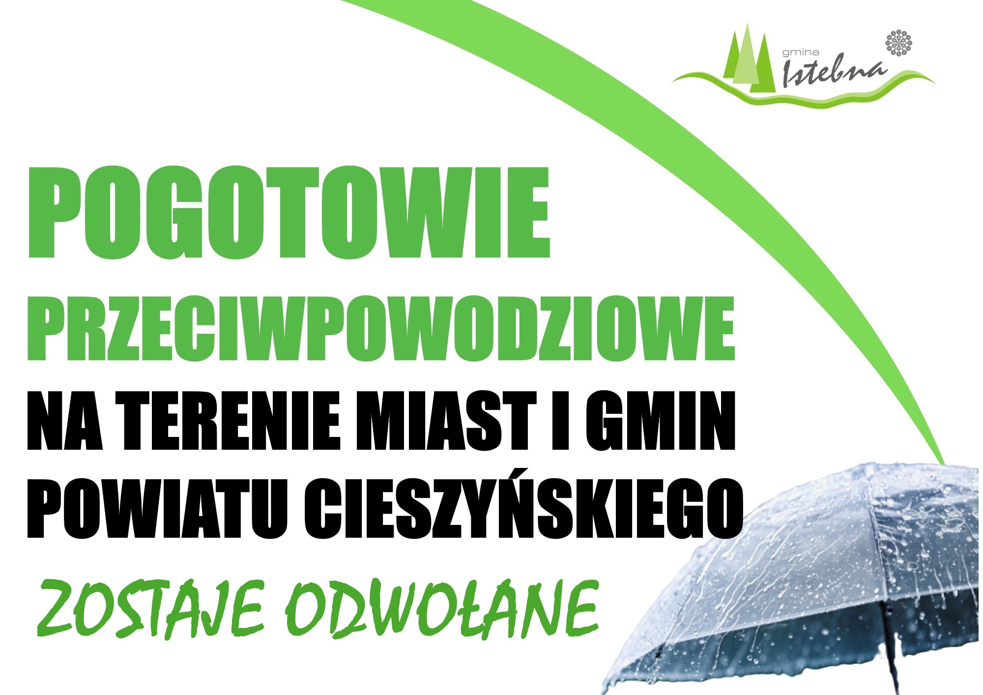 W czwartek, 10 lipca o godzinie 13:00 Janina Żagan Starosta Cieszyński odwołała pogotowie przeciwpowodziowe na terenie powiatu cieszyńskiego Zarządzeniem nr WO.120.34.2025 Starosty Cieszyńskiego z dnia 10 lipca 2025 r. w sprawie odwołania pogotowia przeciwpowodziowego na terenie miast i gmin Powiatu Cieszyńskiego. Dokument został wydany w związku z zanikiem opadów deszczu i stałym obniżaniem się stanów wód w rzekach.