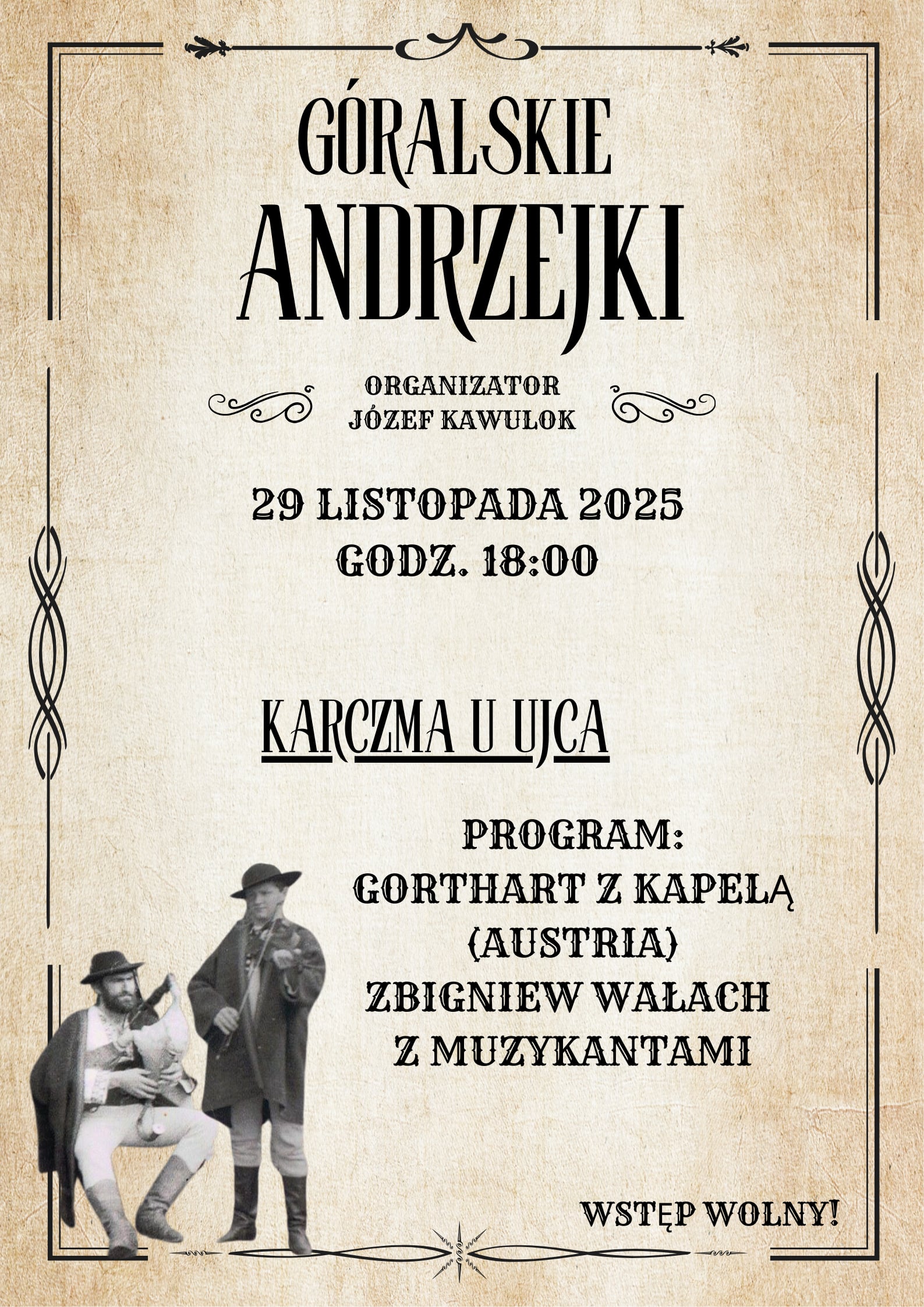 Józef Kawulok zaprasza na Góralskie Andrzejki do Karczmy „U Ujca” w sobotę 29 listopada 2025 r. na godz. 18.00