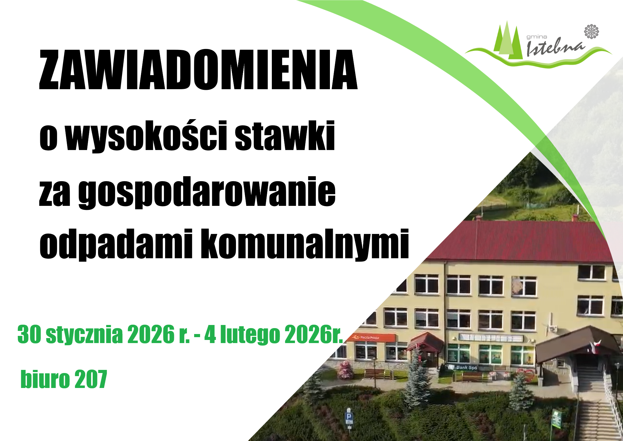Uprzejmie informujemy, że w dniach od 30 stycznia 2026 r. do 4 lutego 2026r. w pokoju 207 Urzędu można odbierać zawiadomienia o wysokości stawki za gospodarowanie odpadami komunalnymi.
