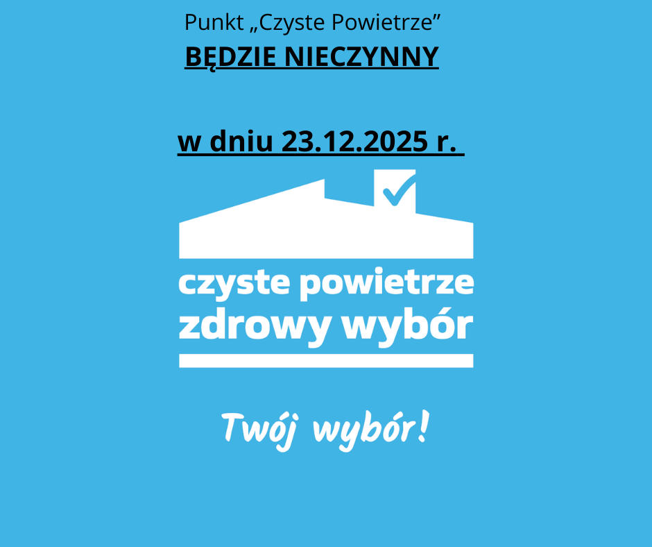 Szanowni Państwo. Uprzejmie informujemy, że w dniu 23.12.2025 r. punkt „Czyste Powietrze” będzie nieczynny.