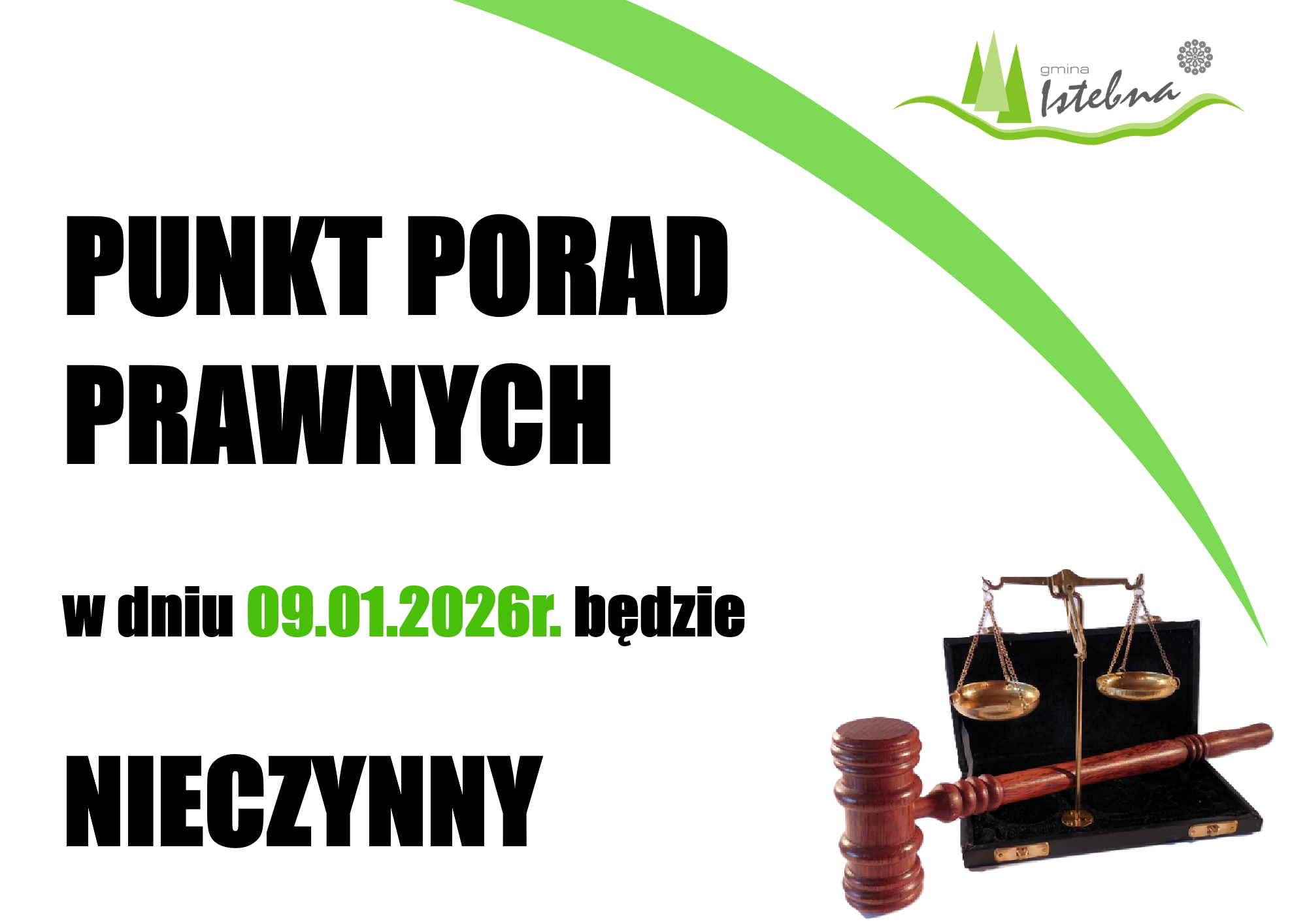 Uprzejmie informujemy, że w dniu jutrzejszym 09.01.2026 r. Punkt Porad Prawnych będzie nieczynny.