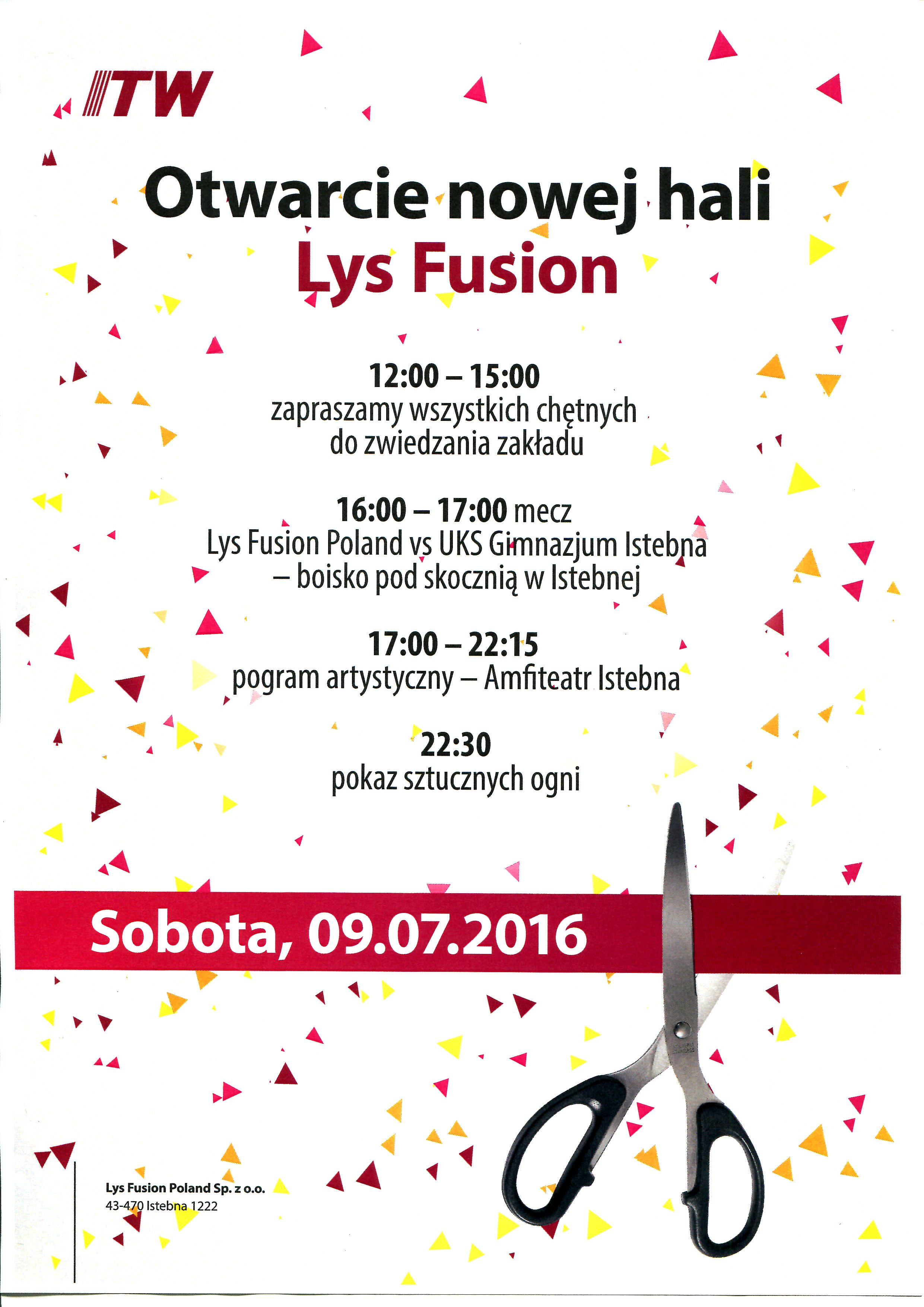 Zapraszamy na uroczyste zwieńczenie inwestorskiego wydarzenia roku 2016 w Gminie Istebna – otwarcie nowo powstałej hali zakładu produkcyjnego Lys Fusion. Będzie okazja do zwiedzenia zakładu i uczestniczenia w rozgrywkach sportowych. Od godziny 17.00 program artystyczny w Amfiteatrze „Pod Skocznią”. Zwieńczeniem wieczoru będzie pokaz sztucznych ogni.