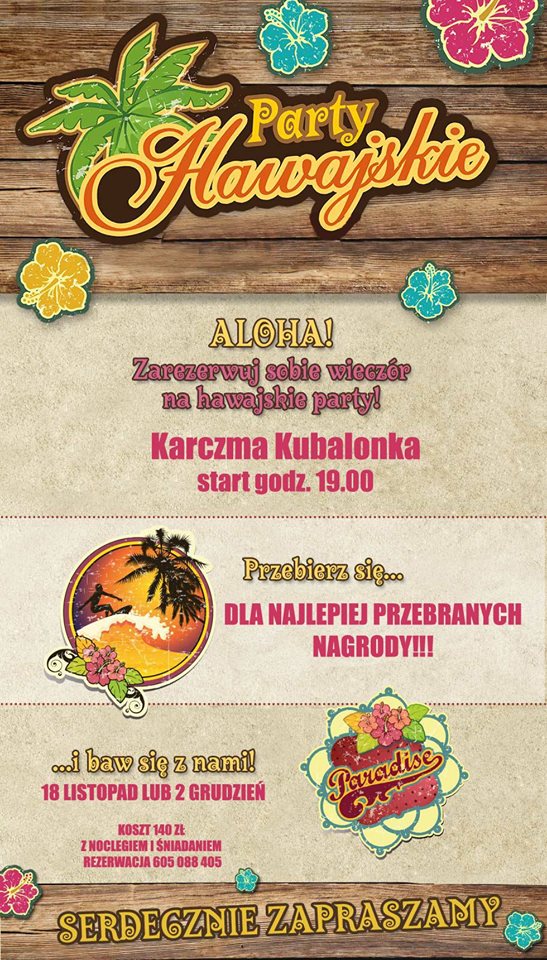 Karczma Kubalonka zaprasza na Andrzejki w stylu Hawajskim. Rozpoczęcie imprezy godzina 19.00. Koszt imprezy wraz z noclegiem i śniadaniem 140 zł. Opcja bez noclegu 90 zł.