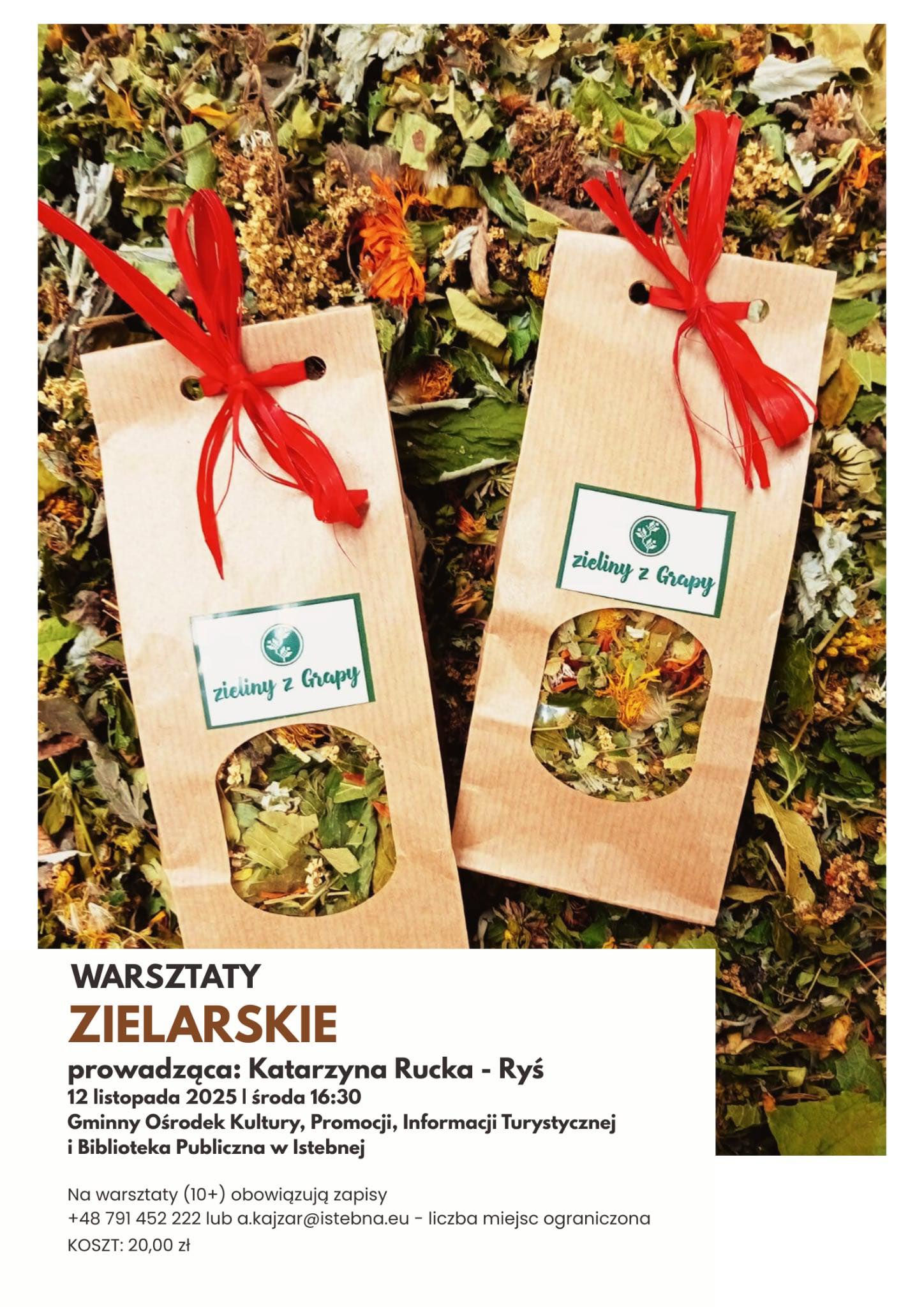 Już 12 listopada 2025 (środa) o godz. 16:30 zapraszamy do Gminnego Ośrodka Kultury w Istebnej na wyjątkowe warsztaty zielarskie z Katarzyną Rucką-Ryś